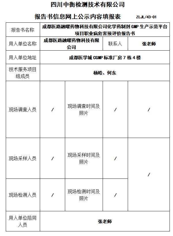 成都醫(yī)路融曜藥物科技有限公司化學(xué)藥制劑GMP生產(chǎn)示范平臺項(xiàng)目預(yù)評價(jià)