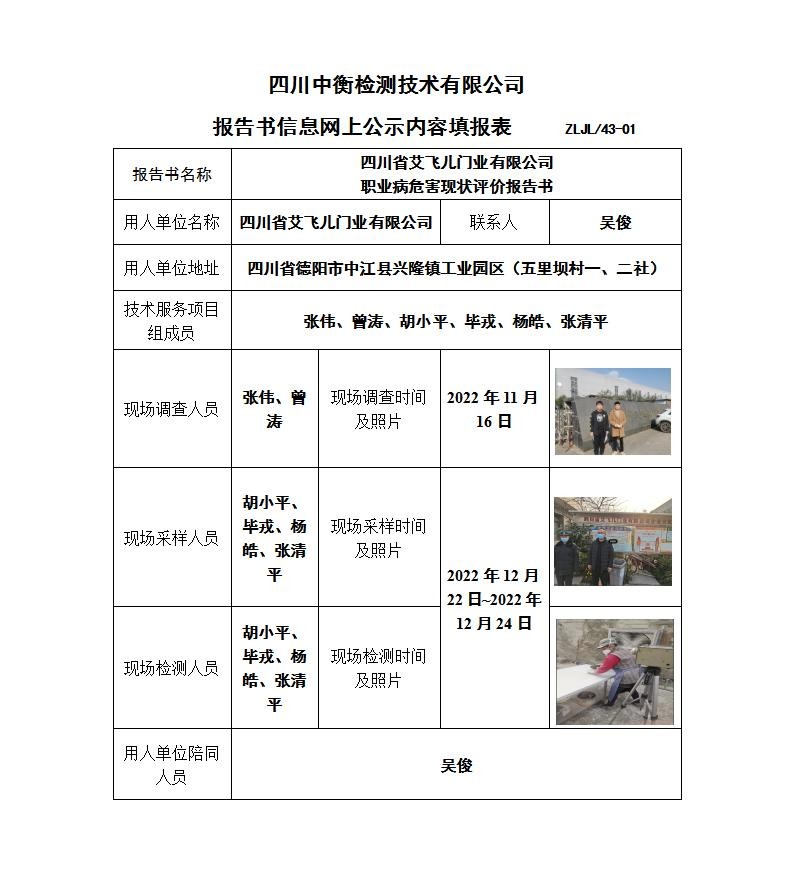 四川省艾飛兒門業有限公司 職業病危害現狀評價