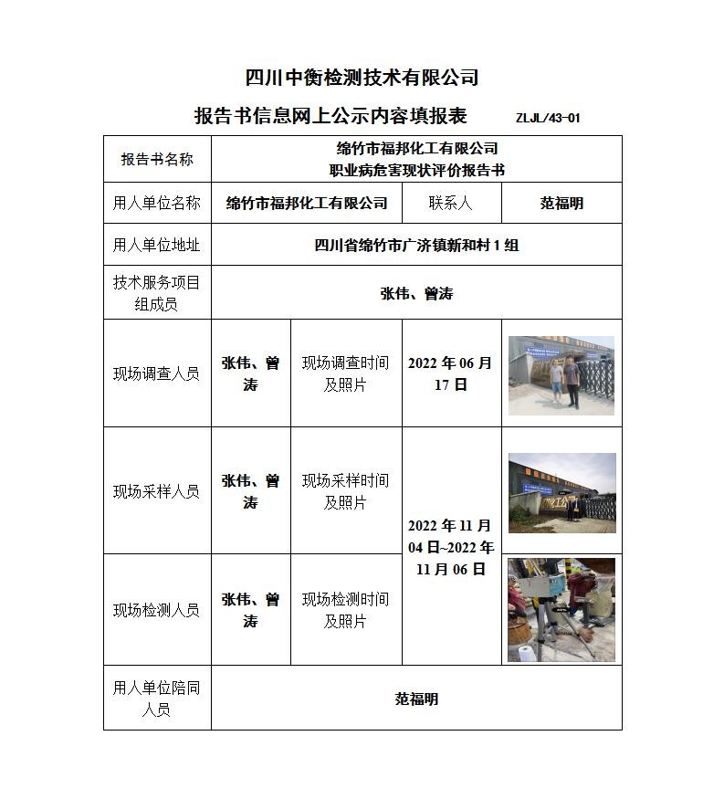 綿竹市福邦化工有限公司 職業病危害現狀評價