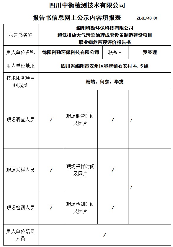 綿陽科勤環保科技有限公司 超低排放大氣污染治理成套設備制造建設項目預評價