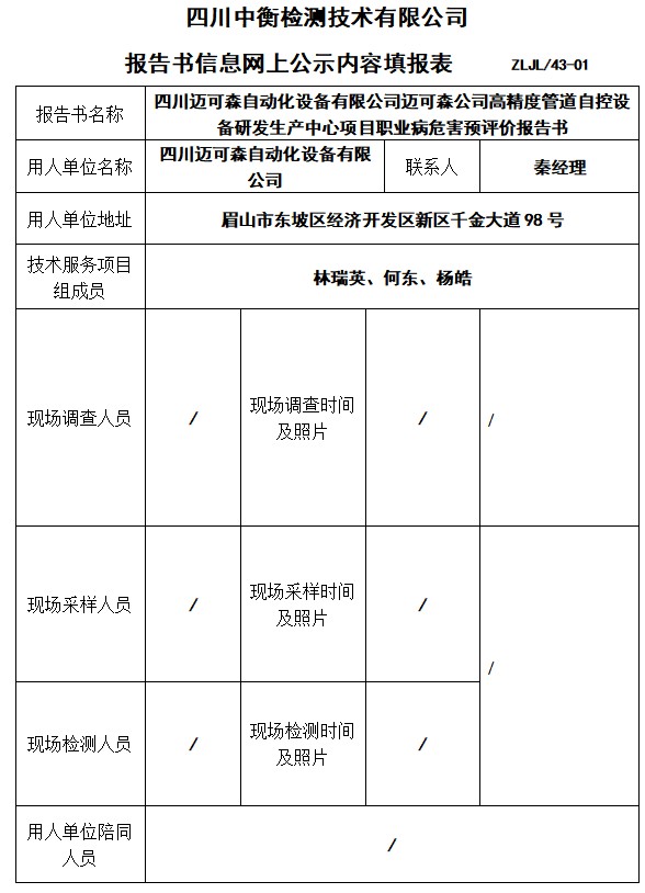 四川邁可森自動(dòng)化設(shè)備有限公司邁可森公司高精度管道自控設(shè)備研發(fā)生產(chǎn)中心項(xiàng)目預(yù)評價(jià)