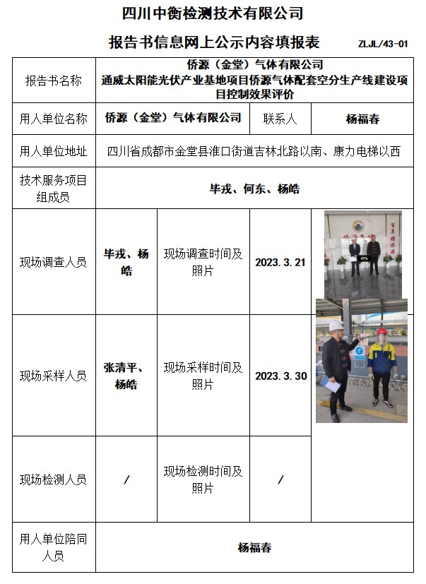 僑源(金堂)氣體有限公司 通威太陽能光伏產業基地項目僑源氣體配套空分生產線建設項目控制效果評價