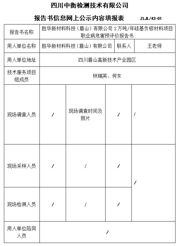 勝華新材料科技(眉山)有限公司3萬噸/年硅基負極材料項目預評價