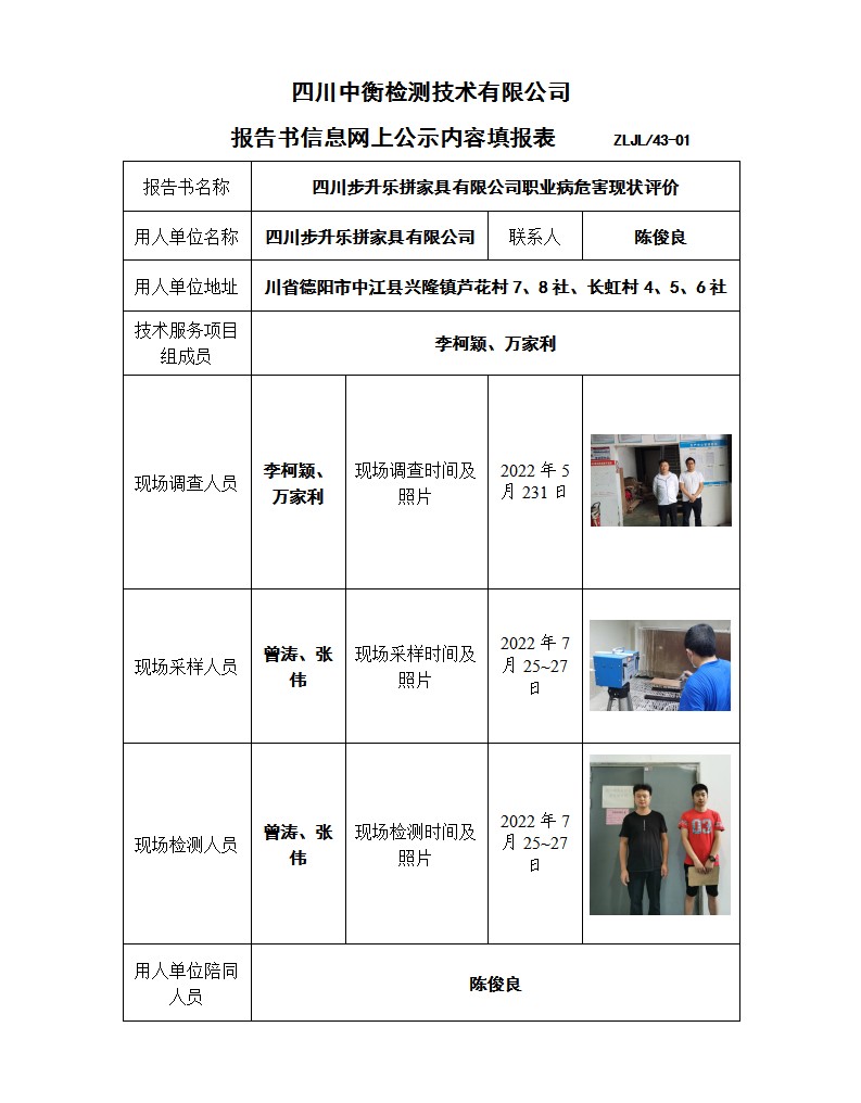 四川步升樂拼家具有限公司 職業病危害現狀評價報告書