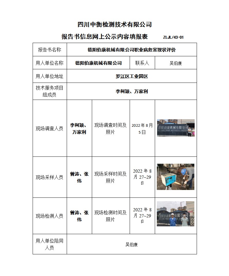 德陽伯康機械有限公司 職業病危害現狀評價報告書