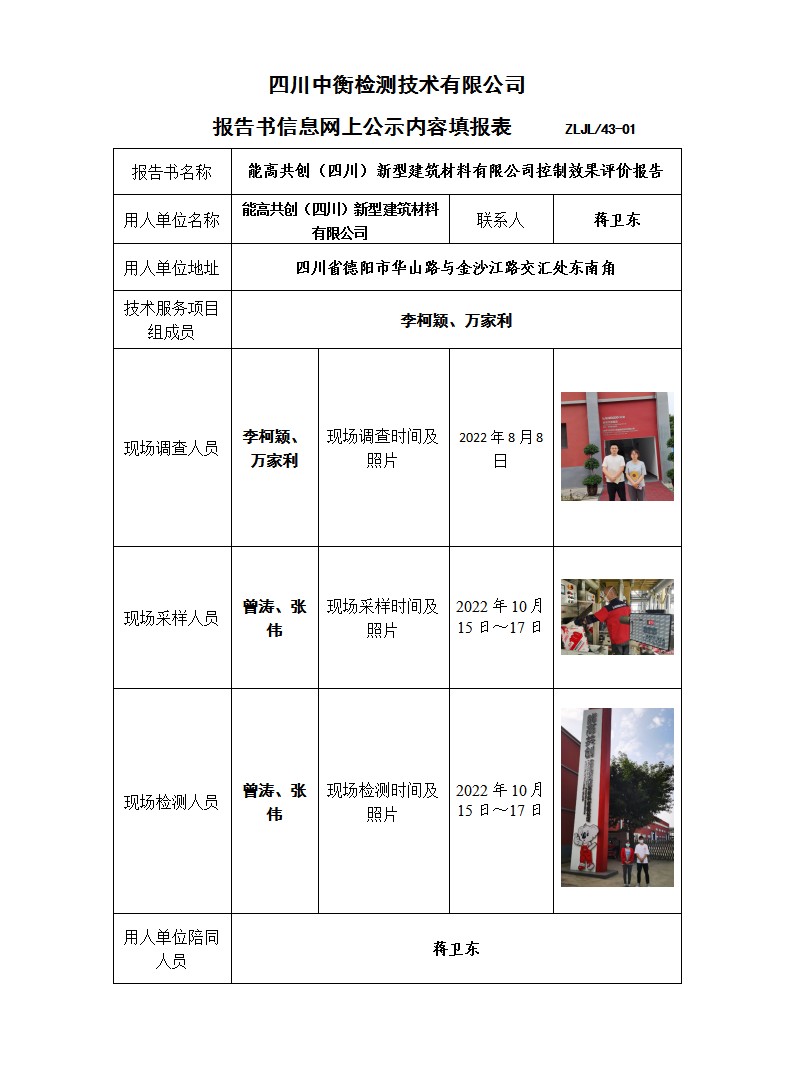 能高共創(四川)新型建筑材料有限公司 能高共創特種干粉砂漿遷建項目 職業病危害控制效果評價報告書
