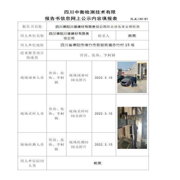 四川德陽川雄建材有限責任公司職業病危害定期檢測