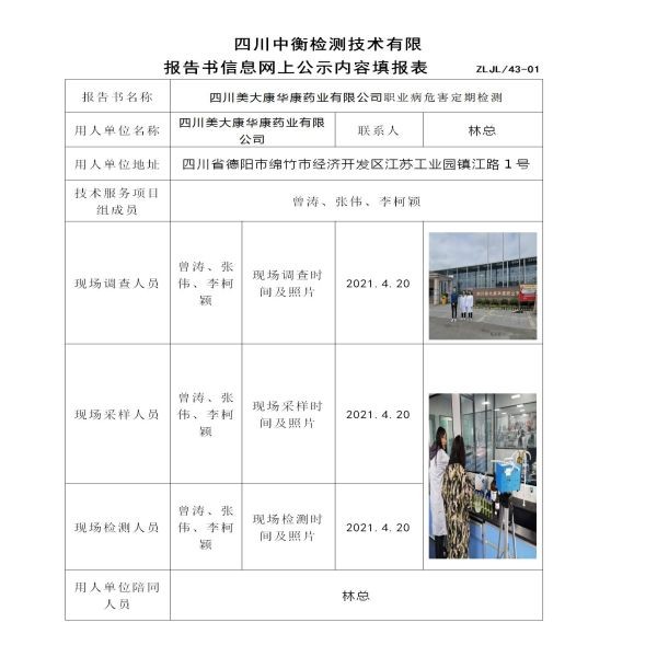 四川美大康華康藥業有限公司職業病危害定期檢測