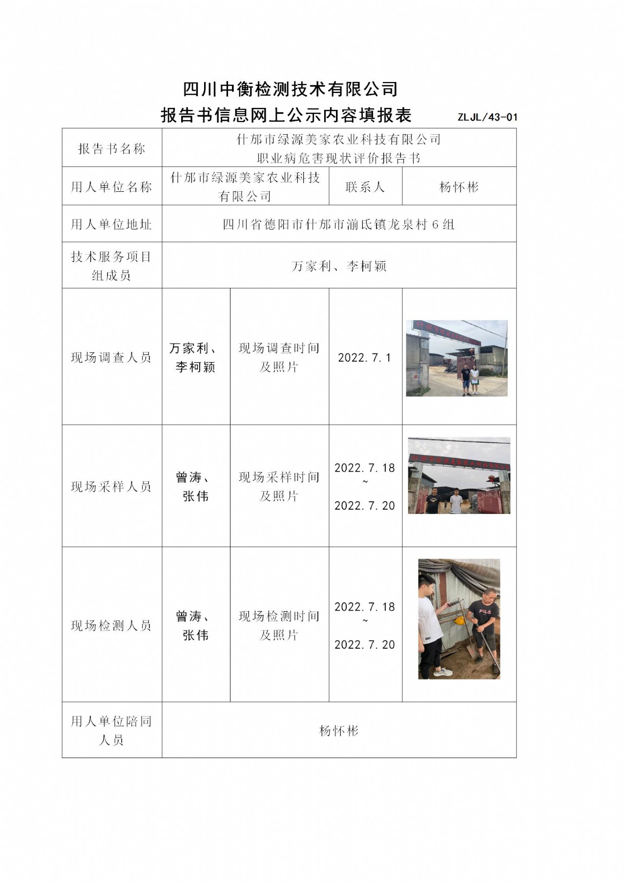 什邡市綠源美家農業科技有限公司 職業病危害現狀評價