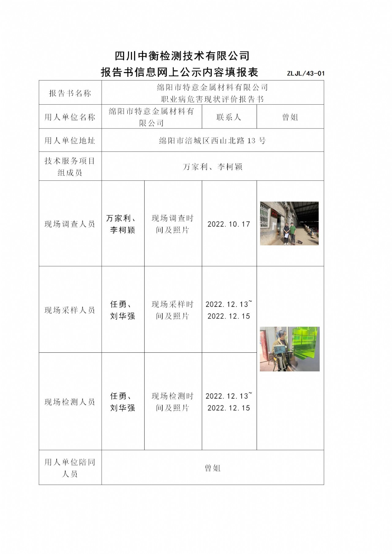 綿陽市特意金屬材料有限公司 職業病危害現狀評價