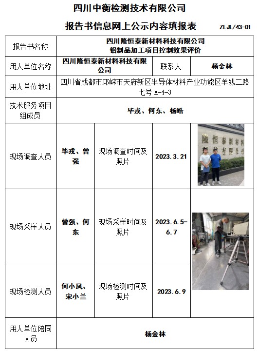 四川隆恒泰新材料科技有限公司 鋁制品加工項目控制效果評價