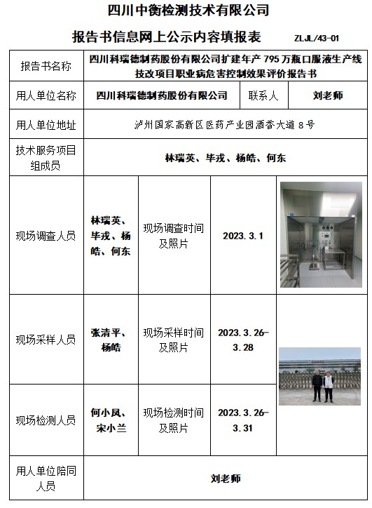 四川科瑞德制藥股份有限公司擴建年產795萬瓶口服液生產線技改項目職業病危害控制效果評價報告書