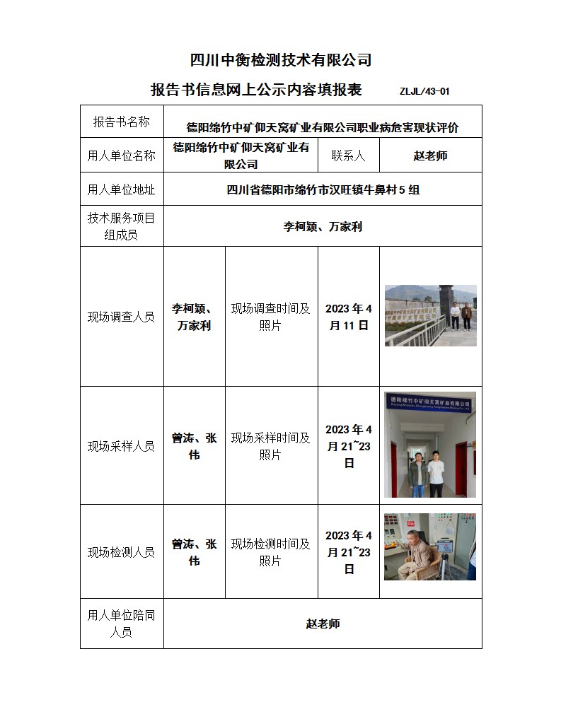 德陽綿竹中礦仰天窩礦業有限公司 職業病危害現狀評價