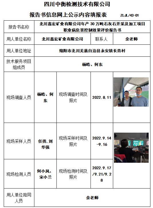 北川鑫宏礦業(yè)有限公司年產(chǎn)30萬噸石灰石開采及加工項(xiàng)目職業(yè)病危害控制效果評(píng)價(jià)報(bào)告書