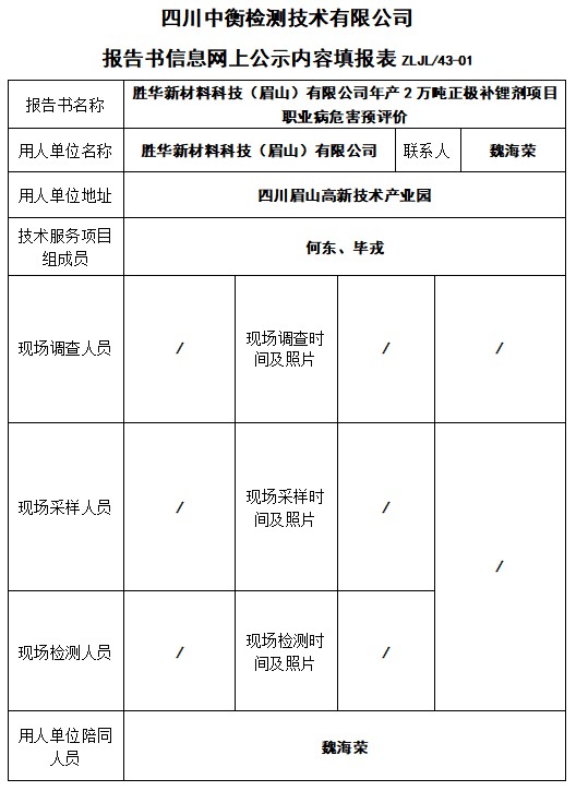 勝華新材料科技(眉山)有限公司年產2萬噸正極補鋰劑項目職業(yè)病危害預評價