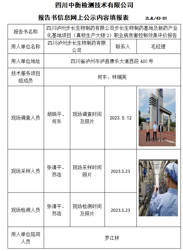 四川瀘州步長生物制藥有限公司步長生物制藥基地及新藥產業化基地項目(真核生產大樓2)職業病危害控制效果評價報告