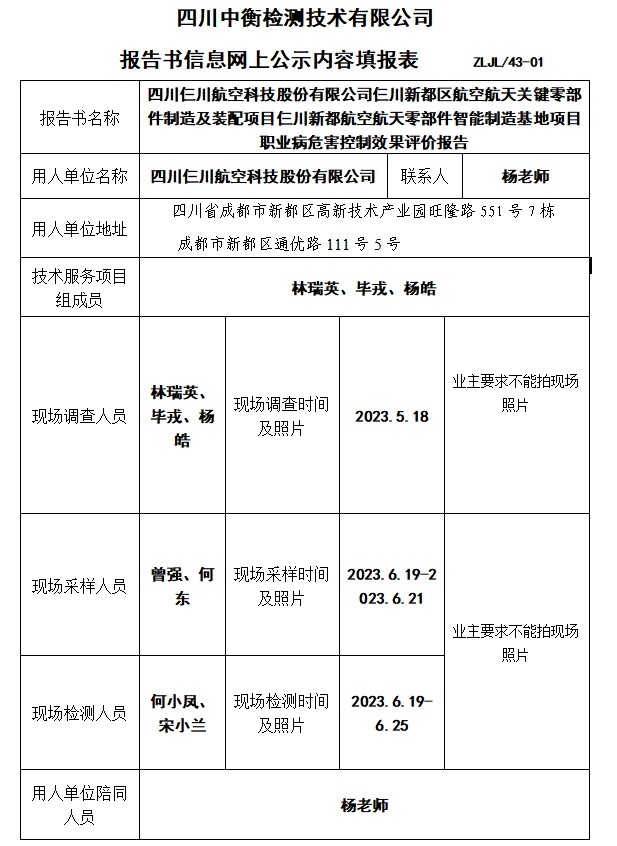 四川仨川航空科技股份有限公司仨川新都區航空航天關鍵零部件制造及裝配項目仨川新都航空航天零部件智能制造基地項目職業病危害控制效果評價報告