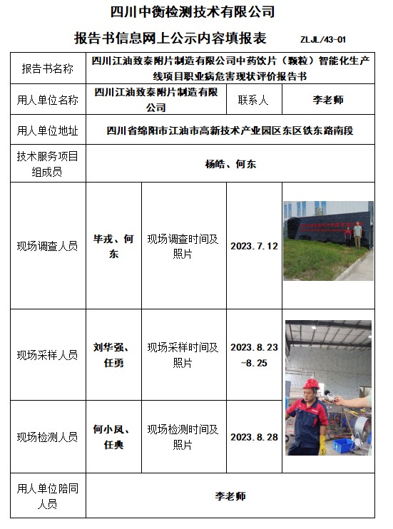 四川江油致泰附片制造有限公司中藥飲片(顆粒)智能化生產線項目職業(yè)病危害現狀評價報告書