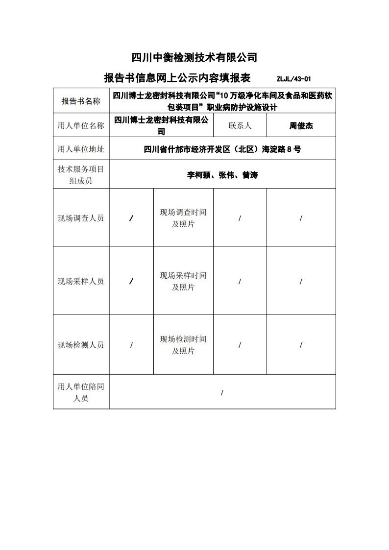 四川博士龍密封科技有限公司“10萬級凈化車間及食品和醫藥軟包裝項目”職業病防護設施設計