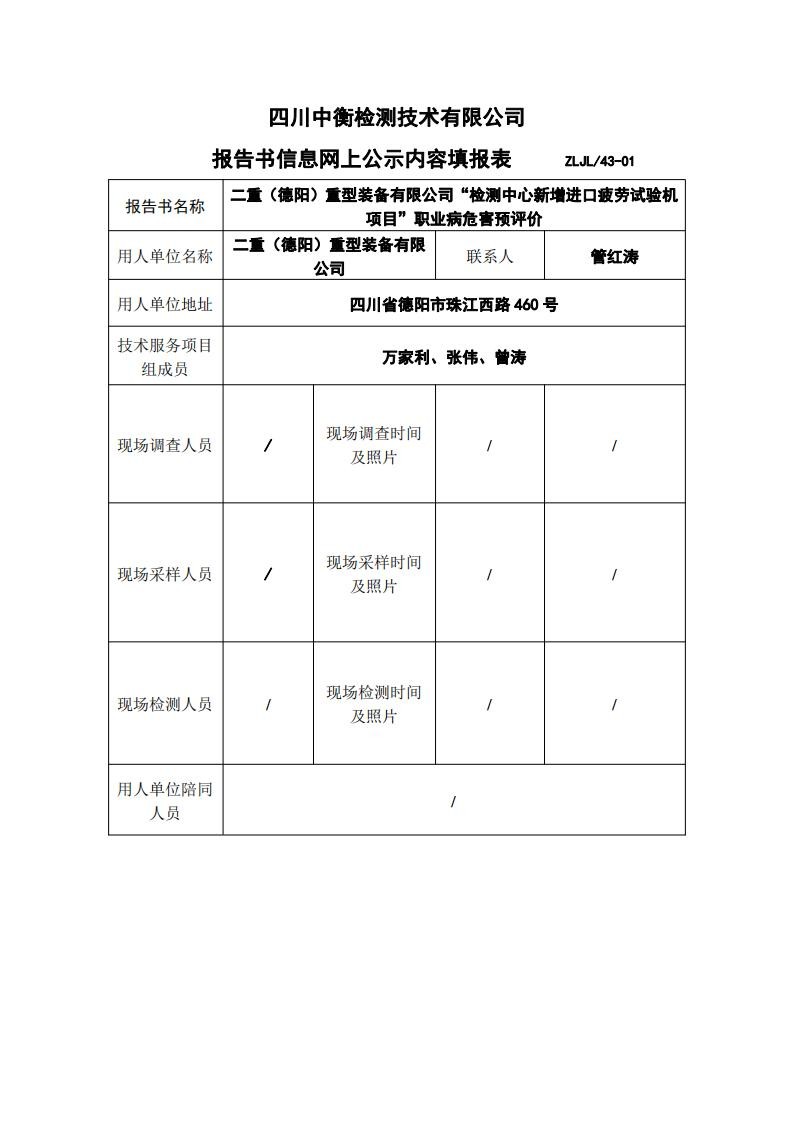 二重(德陽)重型裝備有限公司“檢測中心新增進口疲勞試驗機項目”職業病危害預評價