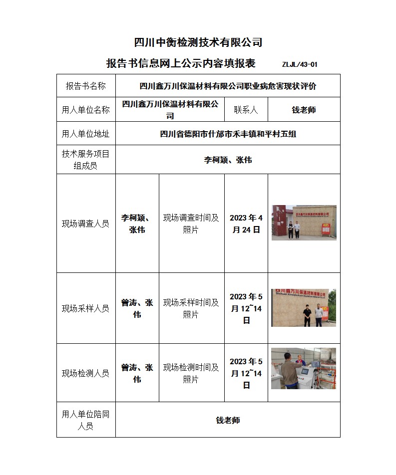四川鑫萬川保溫材料有限公司職業病危害現狀評價