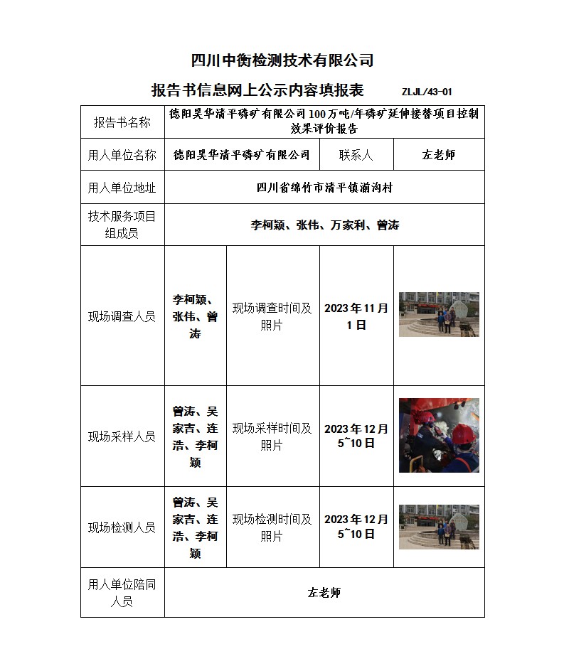 德陽昊華清平磷礦有限公司100萬噸/年磷礦延伸接替項目控制效果評價報告