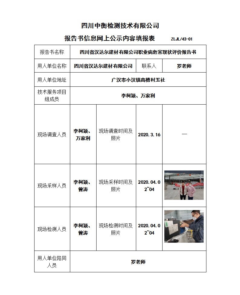 四川省漢達爾建材有限公司 職業病危害現狀評價報告書