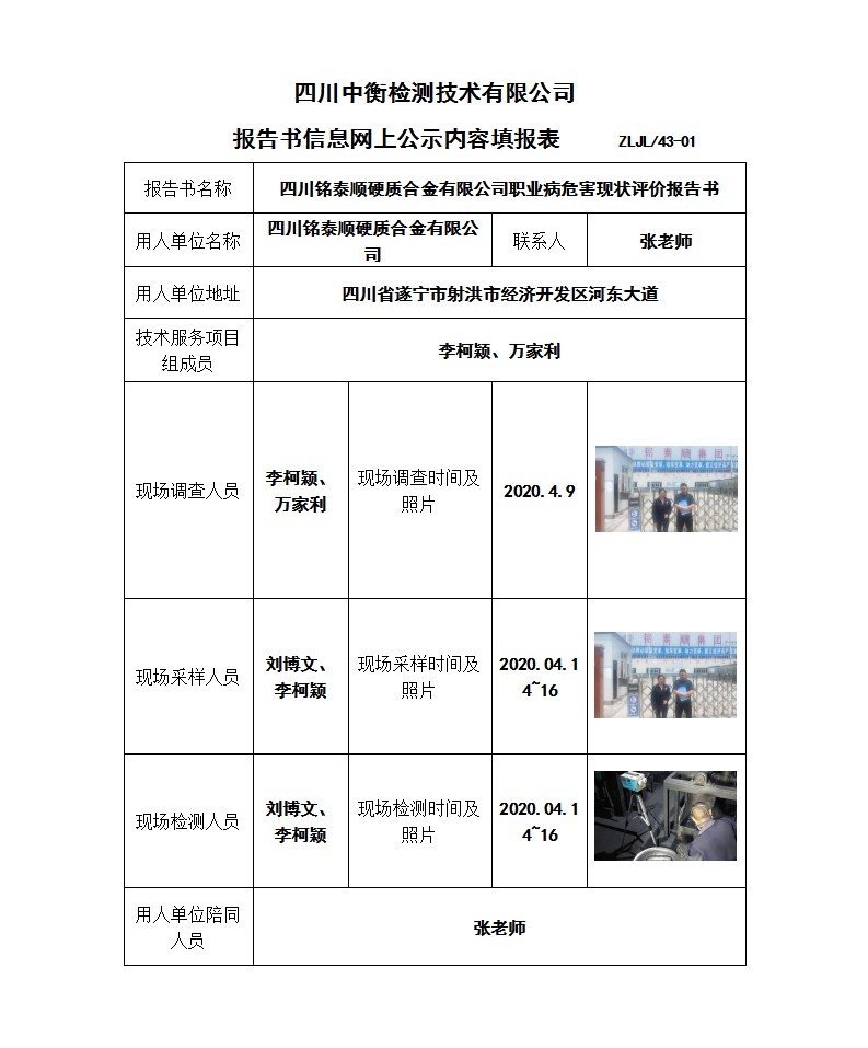 四川銘泰順硬質合金有限公司 職業病危害現狀評價報告書
