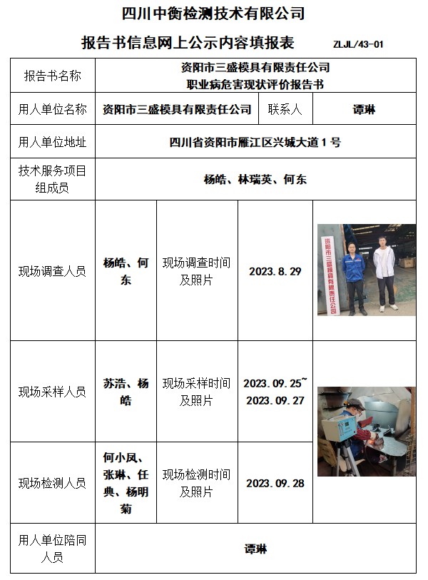 資陽市三盛模具有限責任公司 職業病危害現狀評價報告書