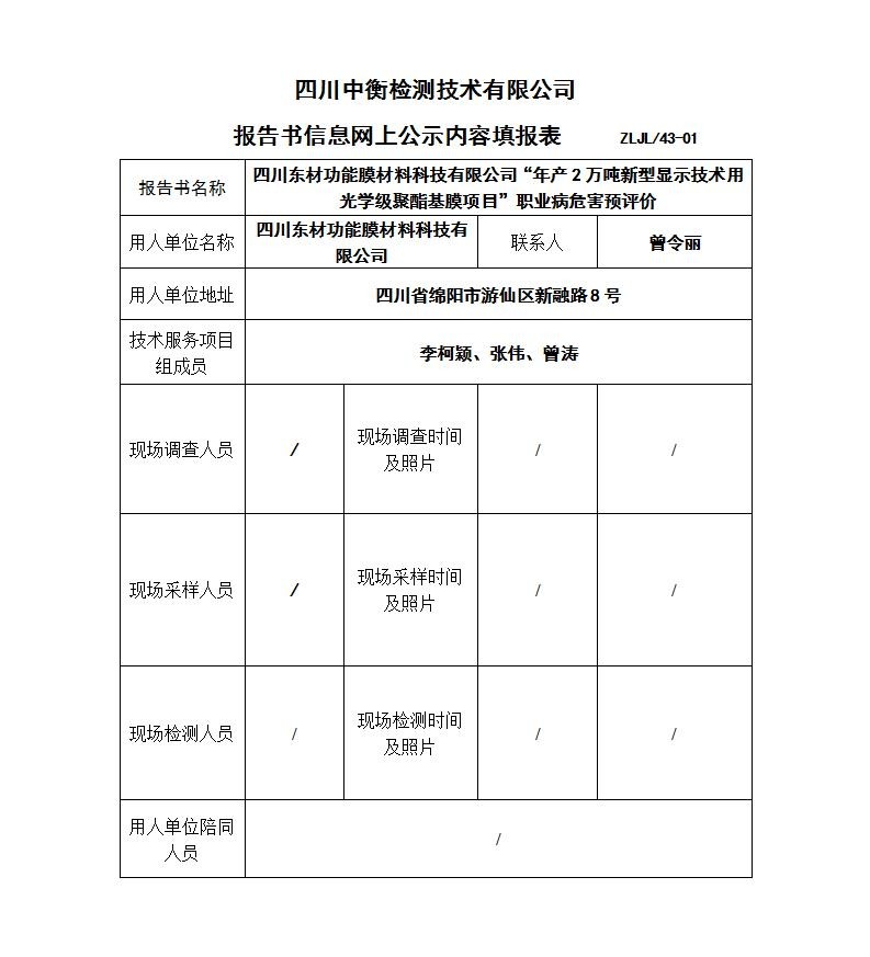 四川東材功能膜材料科技有限公司“年產2萬噸新型顯示技術用光學級聚酯基膜項目”職業病危害預評價
