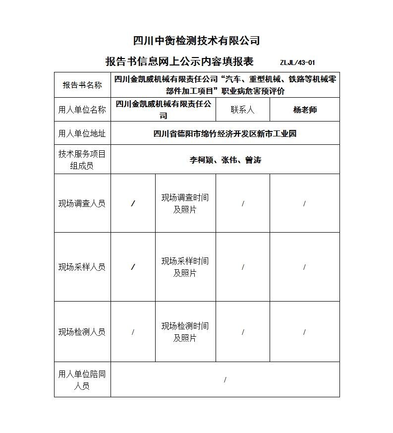 四川金凱威機械有限責任公司“汽車、重型機械、鐵路等機械零部件加工項目”職業病危害預評價