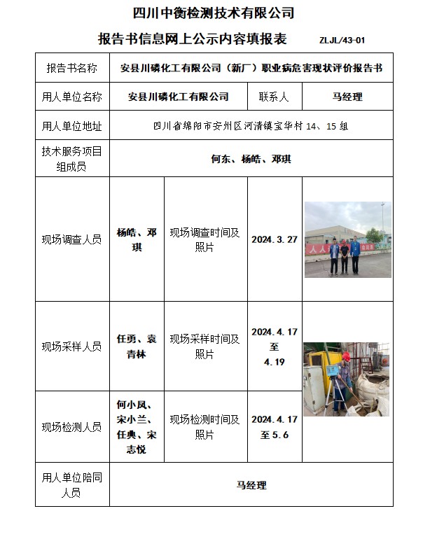 安縣川磷化工有限公司(新廠)職業病危害現狀評價報告書