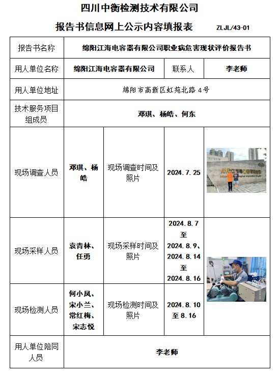 綿陽江海電容器有限公司職業病危害現狀評價報告