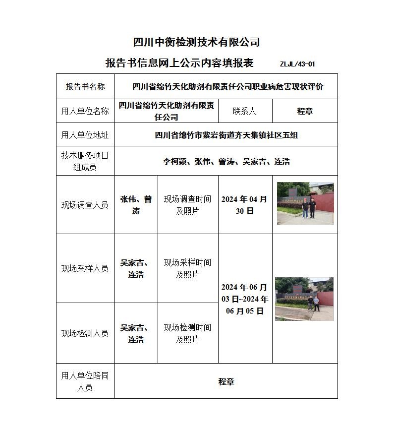 四川省綿竹天化助劑有限責任公司職業病危害現狀評價