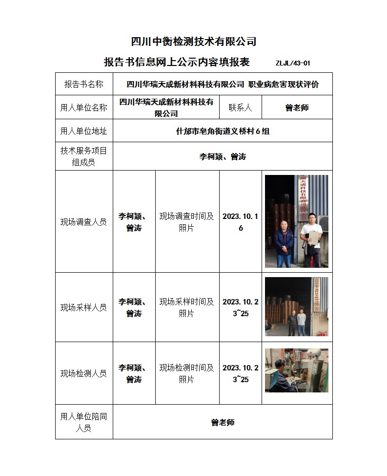 四川華瑞天成新材料科技有限公司 職業病危害現狀評價報告書