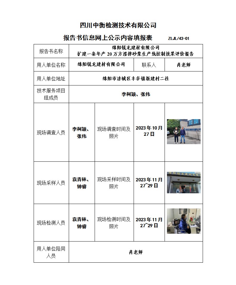 綿陽銳龍建材有限公司 擴建一條年產20萬方濕拌砂漿生產線 職業病危害控制效果評價報告書