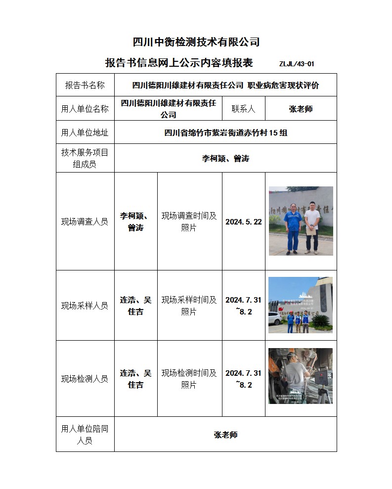 四川德陽川雄建材有限責任公司 職業病危害現狀評價報告書