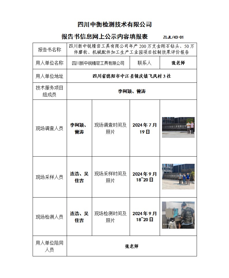 四川新中銳精密工具有限公司 年產200萬支金剛石鉆頭、50萬件磨輪、 機械配件加工生產工業園項目 職業病危害控制效果評價報告書