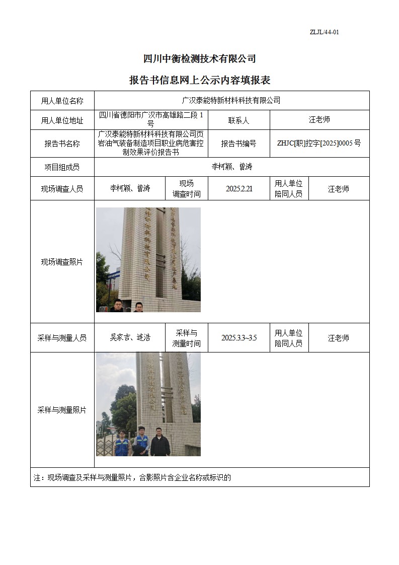 廣漢泰能特新材料科技有限公司 頁巖油氣裝備制造項目 職業(yè)病危害控制效果評價報告書